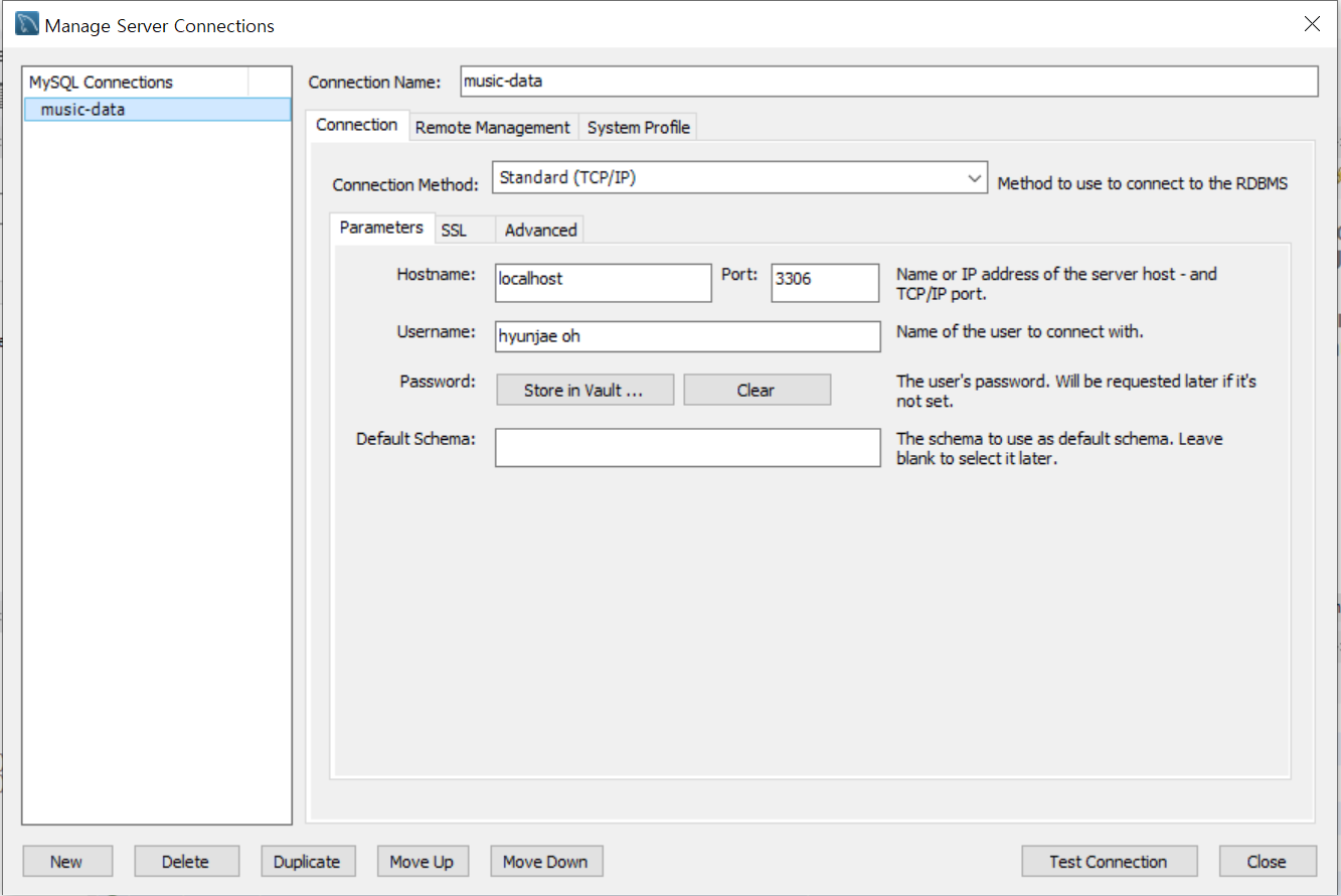 위의 코드에서 host는 처음에 MySQL을 설치하며 사용자를 생성할 때 보통 127.0.0.1 로 생성이 되고 그대로 진행하였다면 127.0.0.1로 설정하고 내가 localhost로 설정하였다면 위처럼 localhost라고 설정하면 된다. port는 기본적으로 제공하는 번호 그대로 사용하였다. 그럴일 없겠지만 만약에 헷갈린다면 MySql -> Database -> Manage Connections 로 들어가 내 Connection 을 선택해 밑의 사진과 같이 보이는 부분을 대치해가며 작성하면 된다.