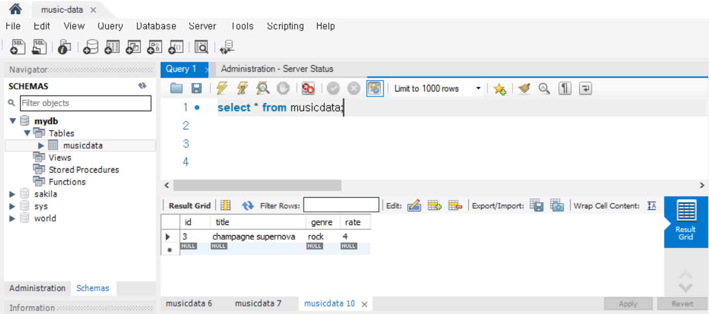다음과 같이 MySQL 워크벤치에서 생성했던 실험 데이터를 확인 할 수 있다.